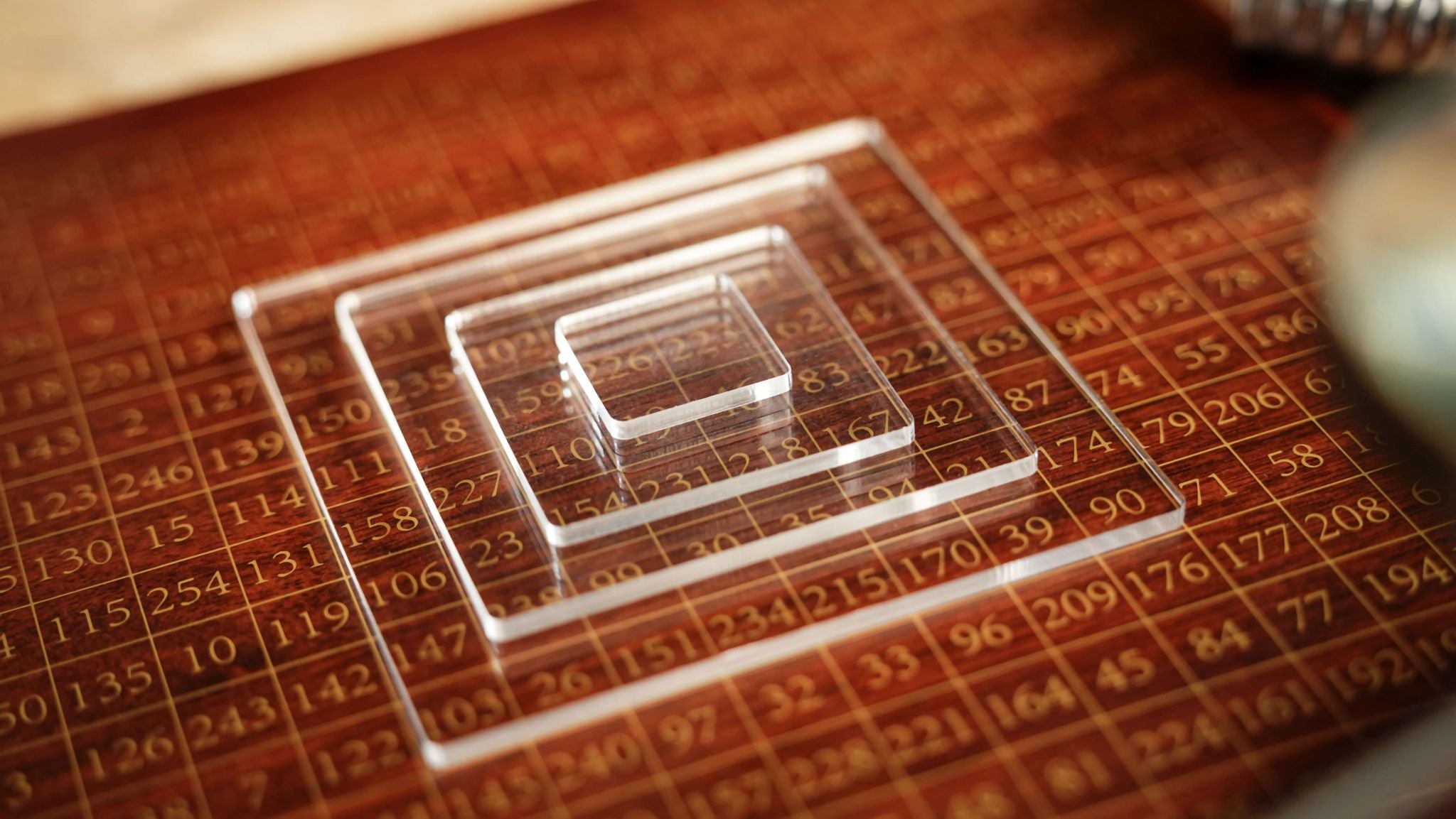 Each acrylic block subtly magnifies the numbers beneath it, framing the chosen area with elegant gold lines, offering both strong visual aesthetics and great handling freedom. It is easy to perform, yet powerful.