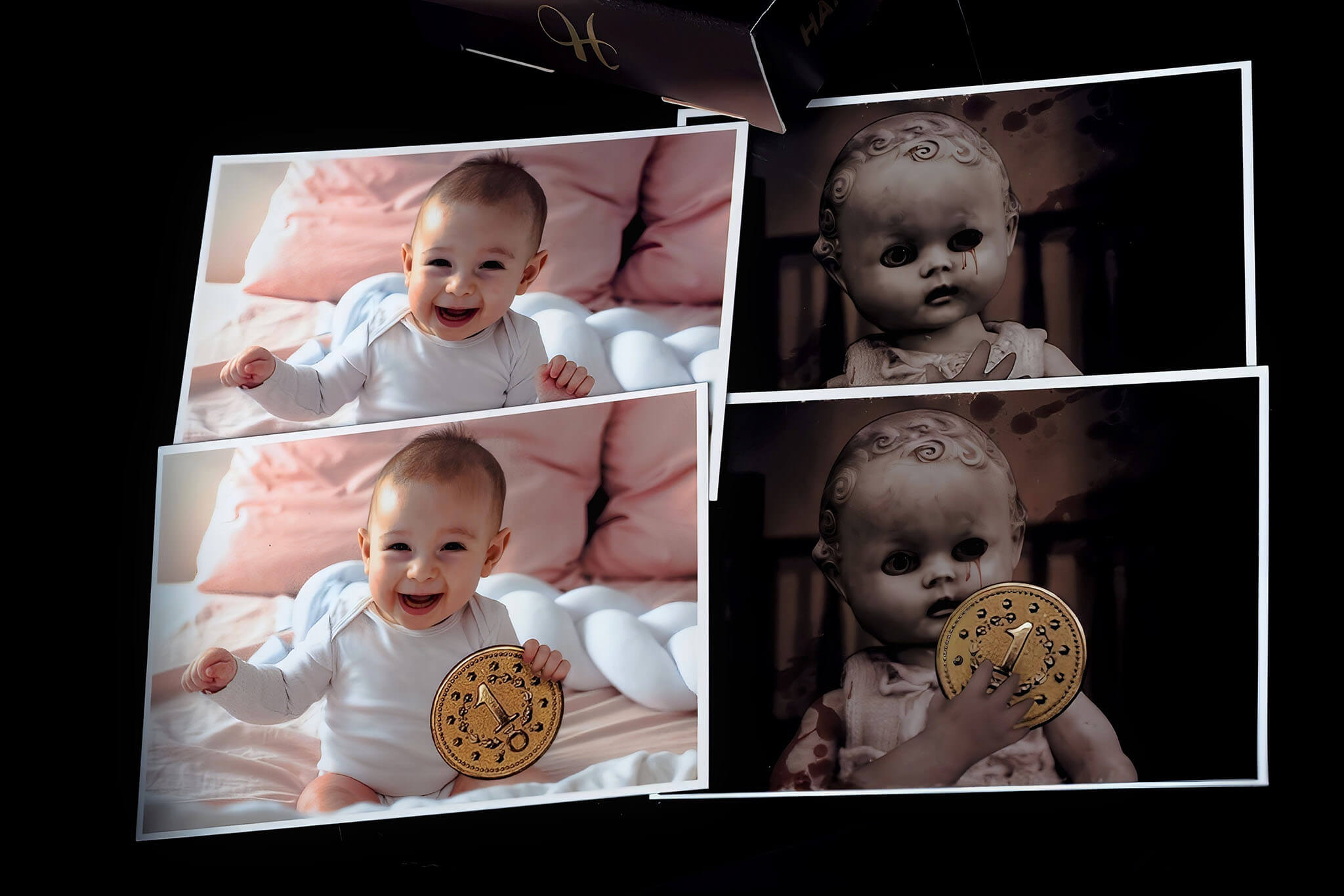 The photo becomes a portal: a lifelike baby’s hand stretches out from the frame, snatches a coin. When they look back at the photo, the coin is now trapped inside the image itself.